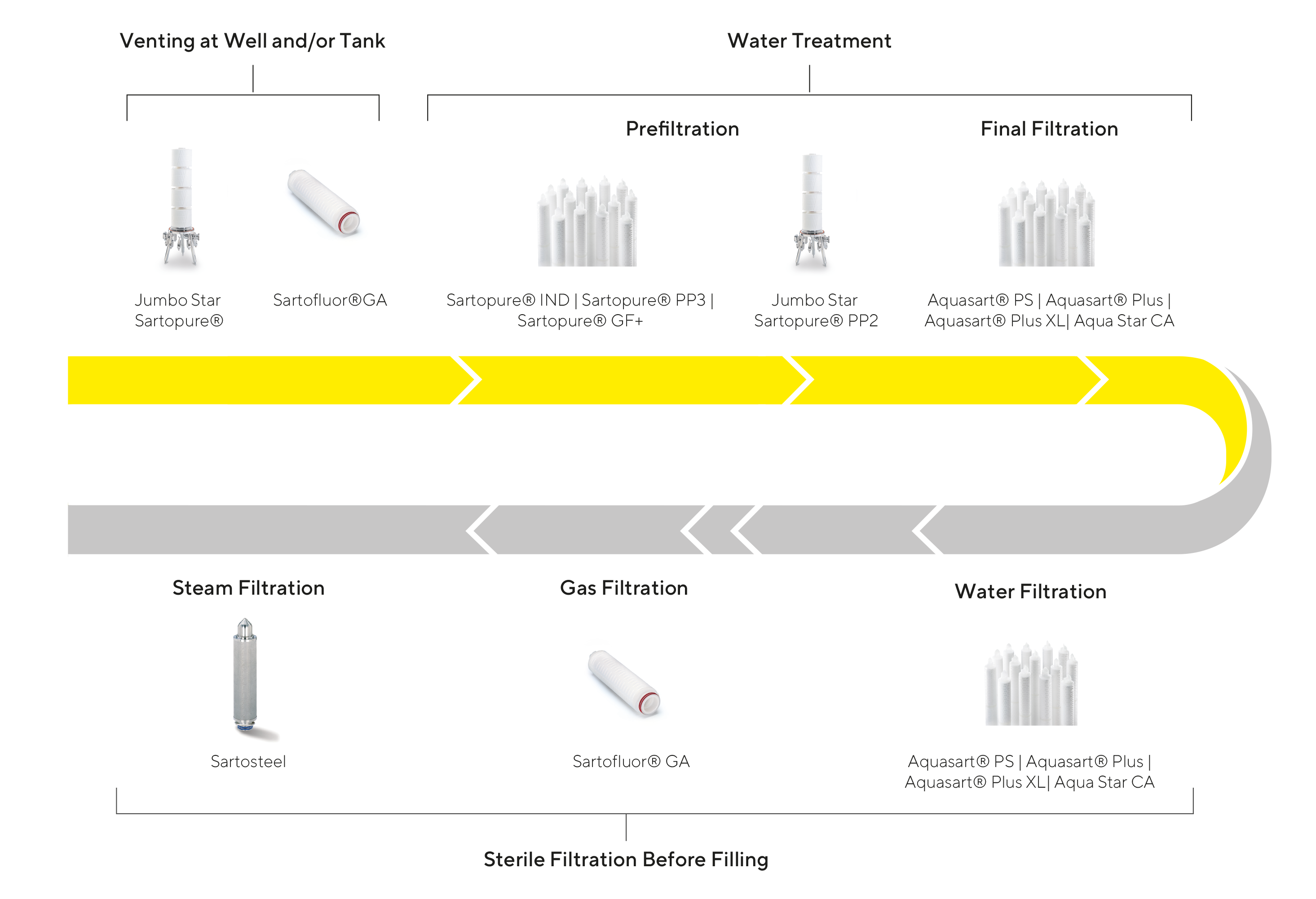 Water Sterile filtration before filling into bottles is done through our Aquasart? Plus, Aquasart? PS, Aquasart? Plus XL and Aqua Star CA cartridge filters for 0.2μm sterile filtration but also with Sartobev? for 1μm membrane filtration of bottled water. The air at the filler must be sterile by filtration through Sartofluor? GA and the steam used for the sterilisation has to be cleaned with particle retention through Sartosteel? filters.?